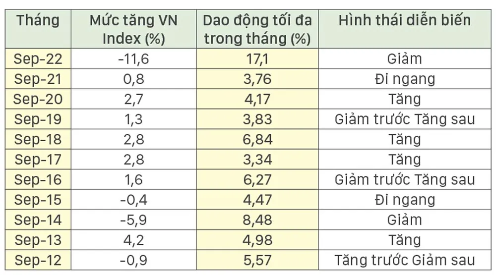 Thống kê trong 10 năm gần nhất, tháng 9 không phải là thời điểm đem lại hiệu quả cao cho hoạt động nắm giữ. Biên độ tăng tính theo tháng lớn nhất là tháng 9-2013 chỉ số VN Index đạt +4,2%. Về xác suất, tháng 9 thường tăng giá hơn là giảm giá trong 10 năm qua (40% giảm giá) nên cũng có thể coi là tích cực từ góc độ quản lý rủi ro.