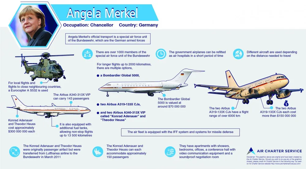 Chiếc máy bay nổi tiếng nhất của Thủ tướng Đức Angela Merkel là chiếc Airbus A340-313X VIP, được đặt tên Konrad Adenauer theo tên Thủ tướng đầu tiên của Đức sau chiến tranh. Bà cũng có một số máy bay khác được quân đội Đức quản lý.