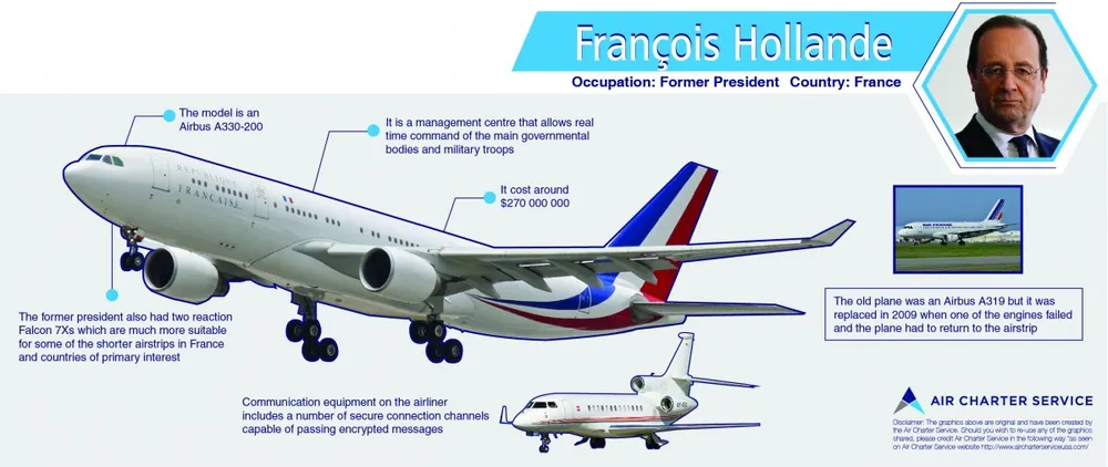 Ông Hollande cũng có 2 máy bay phản lực Dassault Falcons 7Xs, lý tưởng cho các chuyến bay tương đối ngắn hoặc xuyên Đại Tây Dương và được thiết kế cho các đường băng ngắn tại Pháp.