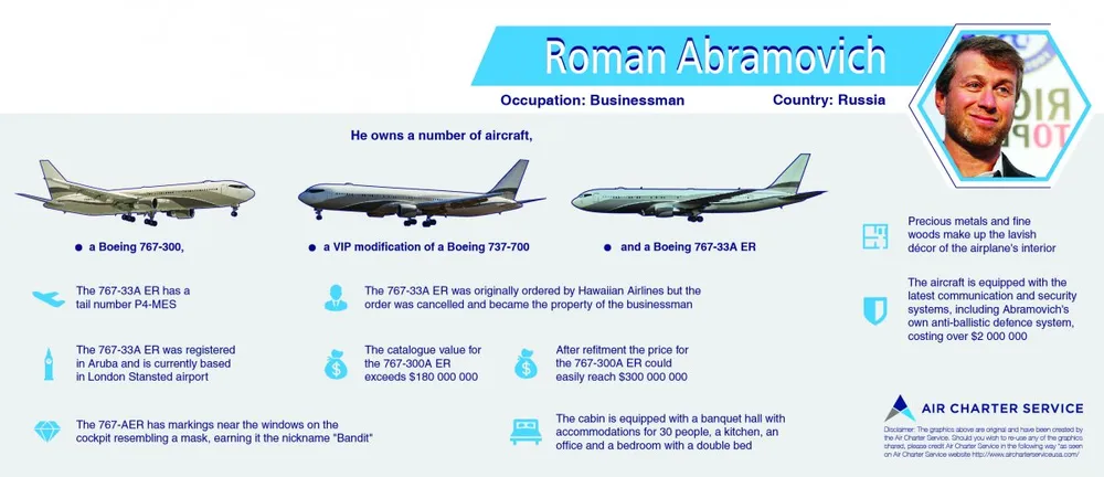 Tỷ phú Nga Roman Abramovich có một số máy bay trong đội bay cá nhân của mình, bao gồm 1 chiếc Boeing 767-33AER. Bên trong máy bay - đã được sửa đổi rất nhiều - có một phòng tiệc cho 30 người, nhà bếp, văn phòn và một phòng ngủ với một giường đôi.