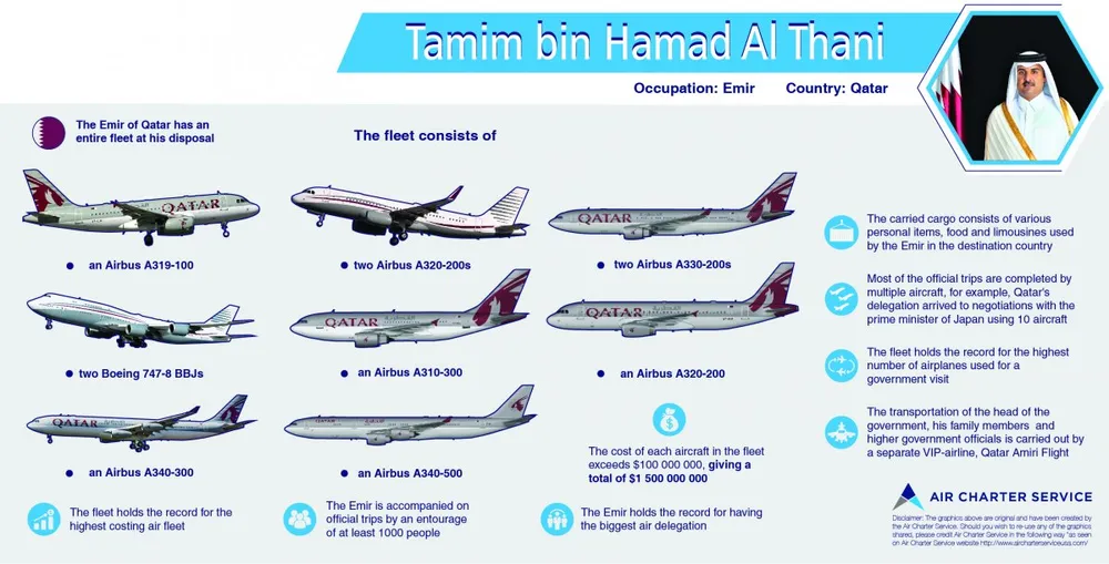 Khi họ đi du lịch một mình, Emir hoặc gia đình của ông và các quan chức cao cấp của chính phủ sử dụng một hãng hàng không VIP riêng, Qatar Amiri Flight. Hạm đội VIP được tạo thành từ 14 chiếc máy bay vào cuối tháng 8-2016, mỗi chiếc có giá 103,5 triệu USD.