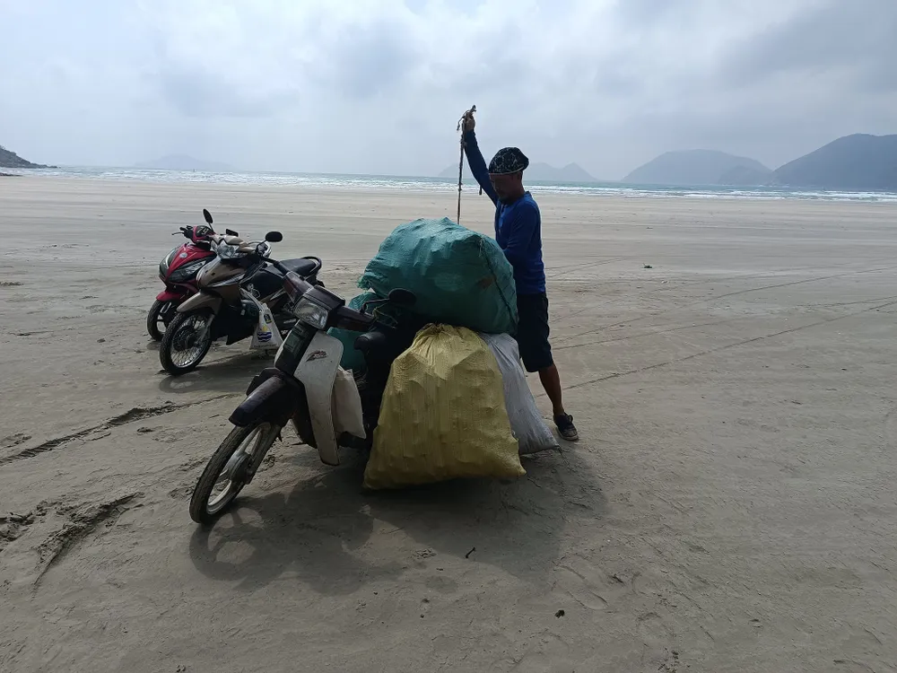 Tình nguyện viên sử dụng xe máy thu gom rác bên bờ biển Côn Đảo. Ảnh: Vì Côn Đảo Xanh