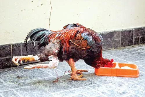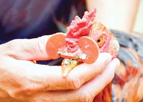 Anh Nguyễn Viết Tư, xóm Quang Nhân, xã Quang Thành, huyện Yên Thành (Nghệ An) nuôi đàn gà hàng ngàn con nhưng đều cho đeo kính. Chiếc kính đeo vào trông giống như mào của con gà. Anh Tư cho biết: “Trước đây đàn gà thường bị trọc lông vùng lưng, cổ, đầu, do chọi nhau, khiến gà chậm lớn. Nhưng cách đây 2 năm, tình cờ xem trên tivi có người đeo kính cho gà để tránh gà chọi nhau, nên tìm đến học hỏi. Việc đeo kính cho gà mục đích để che tầm mắt nhìn thẳng của con gà, nên gà không thể chọi nhau, đuổi cắn nhau, từ đó con nào cũng có bộ lông đẹp, giảm tính hiếu động, nhanh lớn, khi bán được giá hơn”.