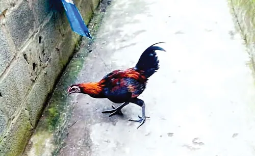 Một con gà trống mào cờ, nặng khoảng 3,5kg, có bộ lông màu đỏ đen bóng mượt. Ngoài 2 chân chính con gà này còn có 2 chân phụ mọc phía sau gần đuôi. 2 chân phụ cũng có 4 ngón nhưng không thể hoạt động. Dù đi lại khó khăn nhưng con gà này vẫn sống khỏe. Anh Trần Bảo Trung, đường Lạc Long Quân, quận Tây Hồ, Hà Nội, chủ nhân của con gà, cho biết: "Tình cờ trong một chuyến công tác thăm Cây đa Tân Trào ở Tuyên Quang, tôi nhìn thấy con gà 4 chân này ở một nhà dân nên hỏi mua về làm cảnh. Nhiều vị khách đã hỏi mua lại với giá cao, nhưng tôi không bán vì muốn để lại nuôi kỷ niệm”.