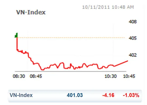Kết thúc phiên hôm nay, VN Index giảm 4,16 điểm (tương đương -1,03%) xuống còn 401,03 điểm.
