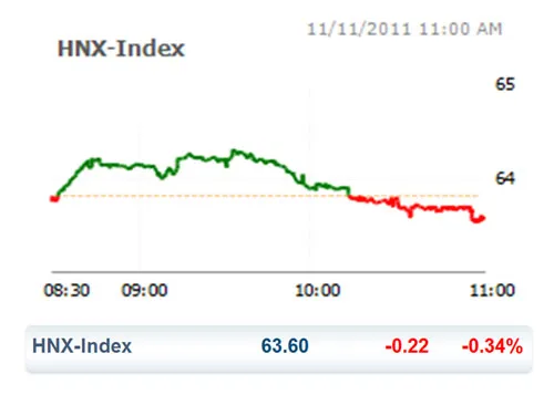 Diễn biến trên sàn HNX cũng khởi đầu đi trong sắc xanh nhưng kết phiên trong sắc đỏ trong sự thiếu hụt dòng tiền. Kết phiên, HNX Index giảm 0,22 điểm (tương đương -0,34%) xuống mức đáy mới là 63,6 điểm.