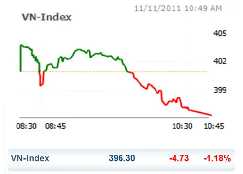 Kết thúc phiên sáng nay, VN Idnex giảm 4,73 điểm (tương đương -1,18%) xuống chỉ còn 396,3 điểm.