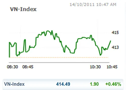 Chốt phiên hôm nay, VN Index tăng 1,9 điểm (tương đương 0,46%) lên mức 414,49 điểm. Toàn sàn có 140 mã tăng, 89 mã giảm và 73 mã đứng giá.