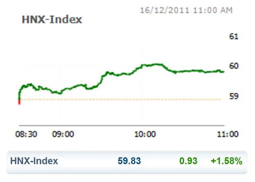 Trên sàn Hà Nội, chỉ số HNX Index đóng cửa ở mức 59,83 điểm, tăng 0,93 điểm (+1,58%). Tổng khối lượng giao dịch toàn phiên đạt 29,7 triệu cổ phiếu (-23,11%), tổng giá trị đạt 254,5 tỷ đồng (-18,22%).