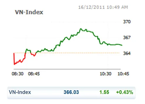 Kết thúc phiên giao dịch ngày 16-12, chỉ số VN Index đóng cửa ở 366,03 điểm, tăng 1,55 điểm (+0,43%). Tổng khối lượng giao dịch toàn phiên đạt 65,2 triệu đơn vị (+61,28%) và tổng giá trị giao dịch đạt 972,1 tỷ đồng (+41,22%).