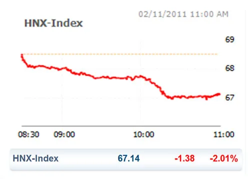 Sắc đỏ cũng chiếm trọn thời gian giao dịch trên sàn HNX. Kết thúc phiên hôm nay, HNX Index giảm 1,38 diểm (tương đương -2,01%) xuống chỉ còn 67,14 điểm.