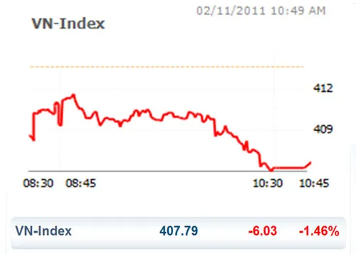 Thiếu lực cầu, VN Index gần như rơi tự do về cuối phiên và xô đổ luôn mốc 410 điểm. Kết thúc phiên, VN Index giảm 6,03 điểm (tương đương -1,46%) xuống còn 407,79 điểm.