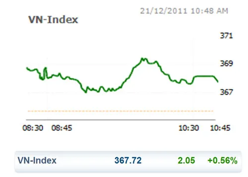 Kết thúc phiên giao dịch ngày 21-12, chỉ số VN Index đóng cửa ở 367,72 điểm, tăng 2,05 điểm (+0,56%). Tổng khối lượng giao dịch toàn phiên đạt 47,2 triệu đơn vị (+1,69%) và tổng giá trị giao dịch đạt 1.236,9 tỷ đồng (+65,63%).