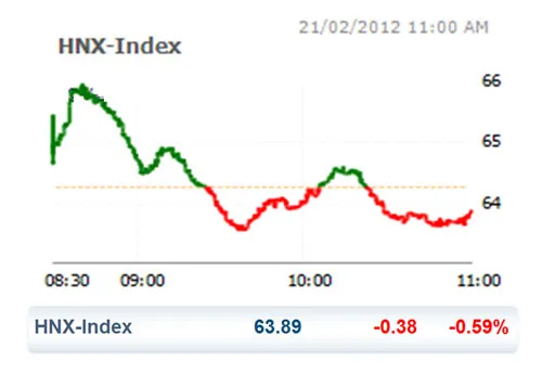 Sức ép tháo hàng cũng góp phần kéo lùi HNX Index trong phiên sáng nay. Cụ thể, chỉ số này kết thúc phiên với số điểm giảm 0,38 điểm (-0,59%) xuống còn 63,89 điểm.