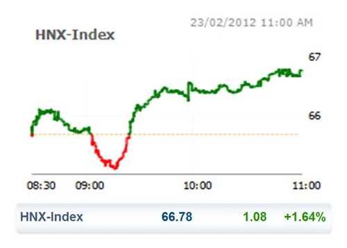 Dòng tiền lớn tiếp tục đẩy HNX Index đi lên trong phiên hôm nay. Cụ thể, số điểm tăng là 1,08 điểm (+1,64%) lên thành 66,78 điểm.