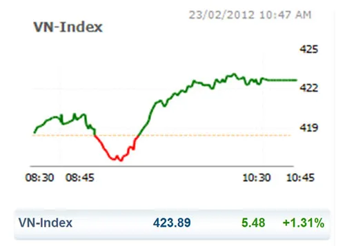 (ĐTTC) - Với kỳ vọng về sự hồi phục của thị trường, bên mua tiếp tục đẩy mạnh giải ngân, giúp VN Index vượt ngưỡng 420 điểm trong phiên giao dịch ngày hôm nay 23-2.