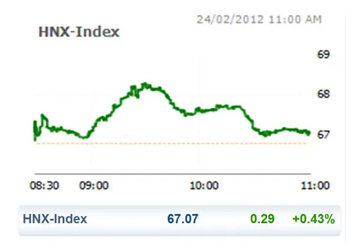 Trái ngược với VN Index, HNX Index vẫn trong thế tiến trong phiên sáng nay. Chốt phiên, chỉ số này nhẹ nhàng ghi thêm 0,29 điểm (+0,43%) lên thành 67,07 điểm.
