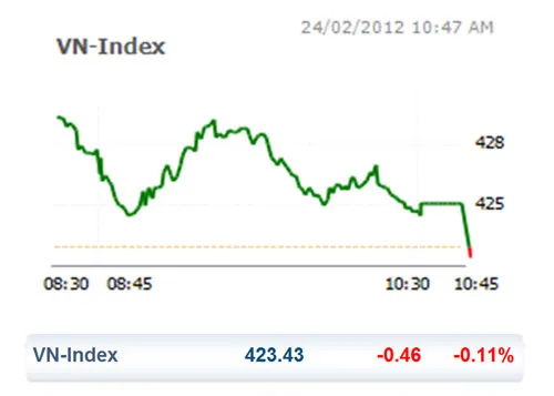 Chốt phiên hôm nay 24-2, VN Index giảm 0,46 điểm (-0,11%) xuống 423,43 điểm.