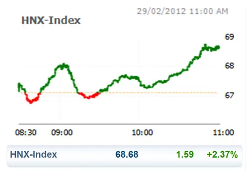 Nếu VN Index chỉ đảo chiều đi lên ở những phút cuối HNX Index duy trì sắc xanh trong phần lớn thời gian giao dịch. Kết thúc phiên sáng nay, chỉ số này tăng 1,59 điểm (+2,37%) lên mức 68,68 điểm.