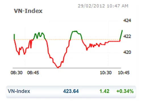 Nhờ động thái này, sắc xanh nhanh chóng chiếm lại ưu thế trên bảng điện tử với 144 mã tăng so với 102 mã giảm và VN Index đảo chiều tăng 1,42 điểm (+0,34%) lên 423,64 điểm.