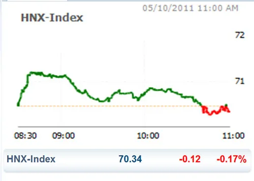 Duy trì sắc xanh trong phần lớn thời gian nhưng HNX Index vẫn kết thúc phiên giao dịch trong sắc đỏ do ảnh hưởng từ sự suy yếu của nhóm CP có vốn hóa lớn. Cụ thể, HNX Index giảm 0,12 điểm (tương đương -0,17%) xuống còn 70,34 điểm.