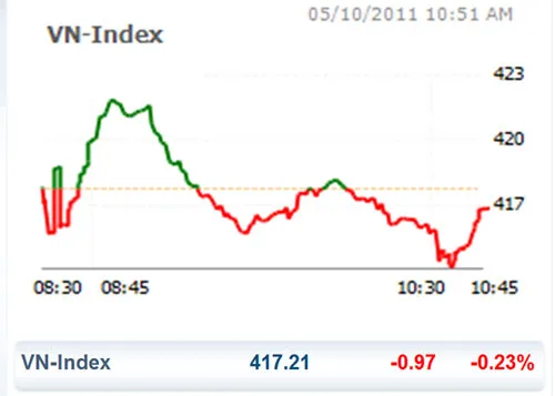 Chốt phiên, VN Idnex giảm 0,97 điểm (tương đương -0,23%) xuống mức 417,21 điểm. Những mã góp phần kéo ngược VN Idnex trong giao dịch sáng nay là MSN, BVH, VCB, FPT, HAG và VIC.