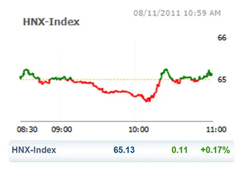 Với diễn biến thuận lợi này, HNX Index đã kết thúc phiên trong sắc xanh khi ghi được 0,11 điểm (tương đương +0,17%) lên 65,13 điểm.