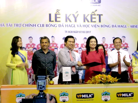 (ĐTTCO) - Sáng 7-3, tại KS Rex TPHCM đã diễn ra lễ ký kết nhà tài trợ chính giữa CTCP sữa chuyên nghiệp Việt Nam (VP Milk) cho CLB bóng đá HAGL và Học viện bóng đá HAGL- Arsenal- JMG (ảnh).