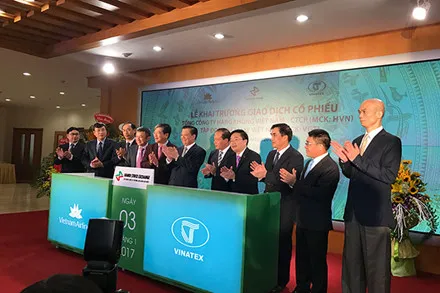 Ngay sau khi Bộ trưởng Bộ Tài chính Đinh Tiến Dũng đánh cồng khai trương phiên giao dịch đầu tiên của năm 2017 của thị trường chứng khoán Việt Nam, hai ông lớn là Vietnam Airlines và Tập đoàn Dệt may Việt Nam chính thức lên sàn UPCoM. Đúng như dự đoán của giới đầu tư, ngay trong phiên giao dịch sáng, cổ phiếu HVN nhanh chóng tăng kịch trần từ mức thám chiếu 28.000 đồng/CP lên 39.200 đồng và dư mua hàng triệu đơn vị. Tại mức giá này, vốn hóa thị trường của Vietnam Airlines lên tới hơn 48.000 tỉ đồng (khoảng 2,15 tỉ USD).