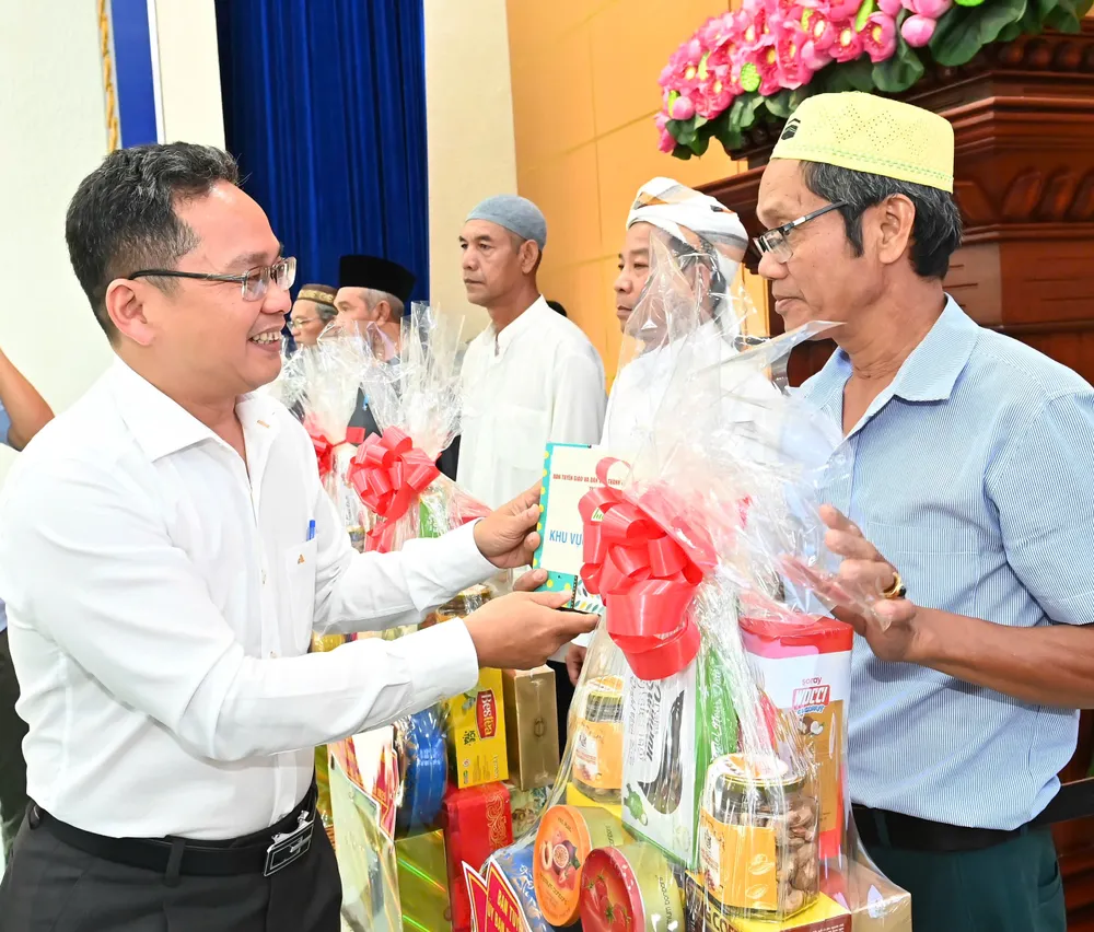 Ông Nguyễn Mạnh Cường tặng quà chúc mừng nhân tháng Ramadan Hồi lịch 1446 - Dương lịch 2025. Ảnh: VIỆT DŨNG