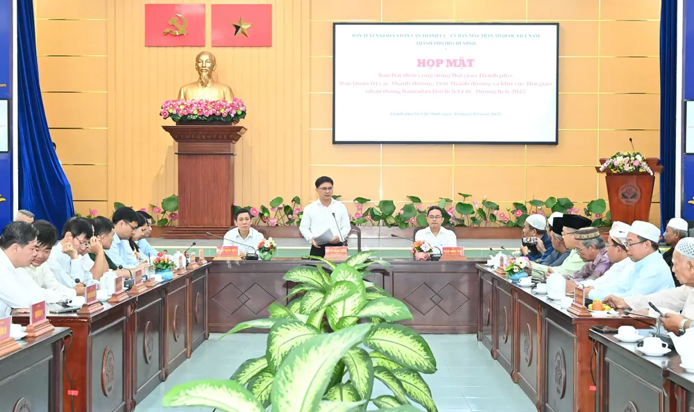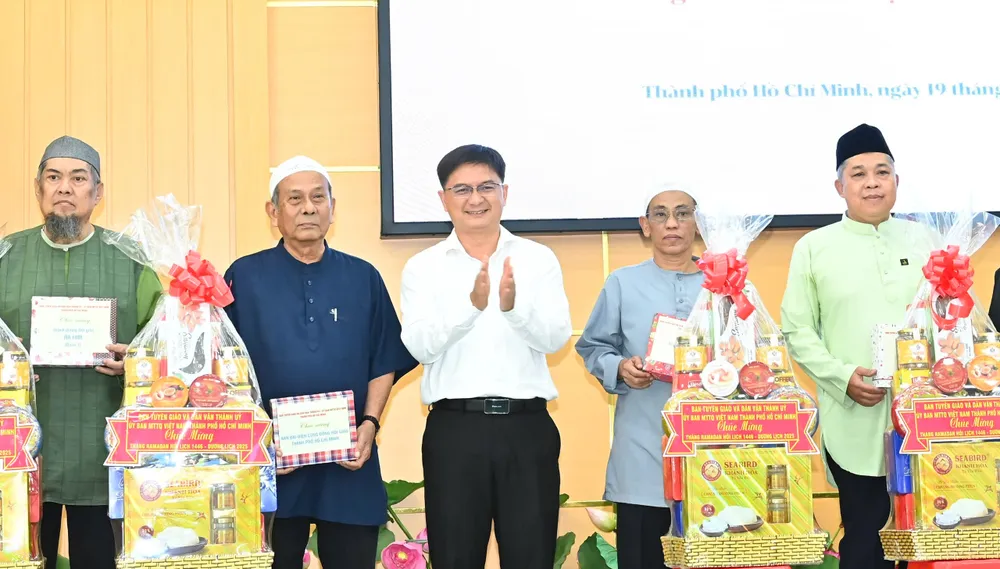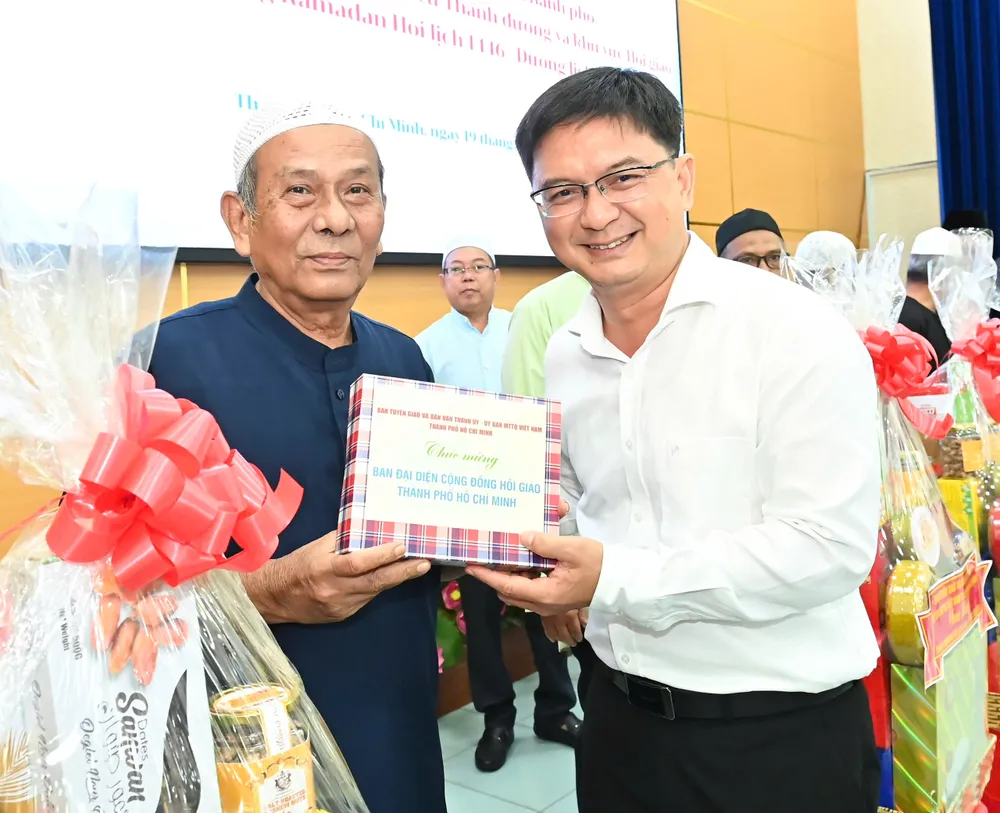 Nhằm kịp thời chúc mừng, động viên các chức sắc, chức việc và đồng bào tín đồ Hồi giáo nhân tháng Ramadan Hồi lịch 1446 - Dương lịch 2025, Ban Tuyên giáo và Dân vận Thành ủy TPHCM phối hợp Ban Thường trực Ủy ban MTTQ Việt Nam TPHCM tặng các phần quà đến Ban Đại diện Cộng đồng Hồi giáo TPHCM, Ban Quản trị các Thánh đường, Tiểu Thánh đường và các điểm sinh hoạt Hồi giáo tập trung tại TPHCM.