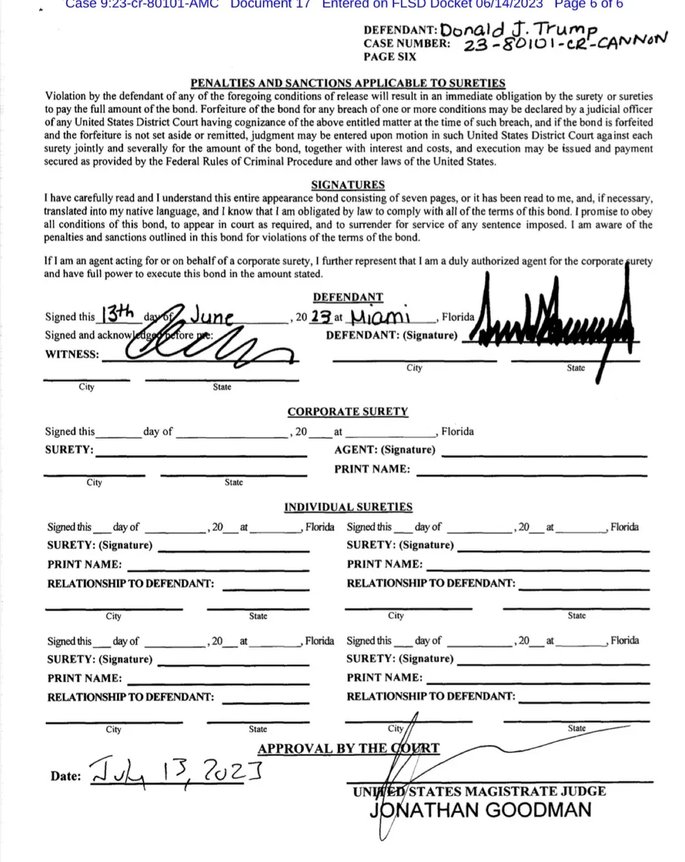 Theo đó, tài liệu có chữ ký của Thẩm phán Jonathan Goodman dường như là ngày 13 tháng 7 năm 2023, thay vì ngày 13 tháng 6.