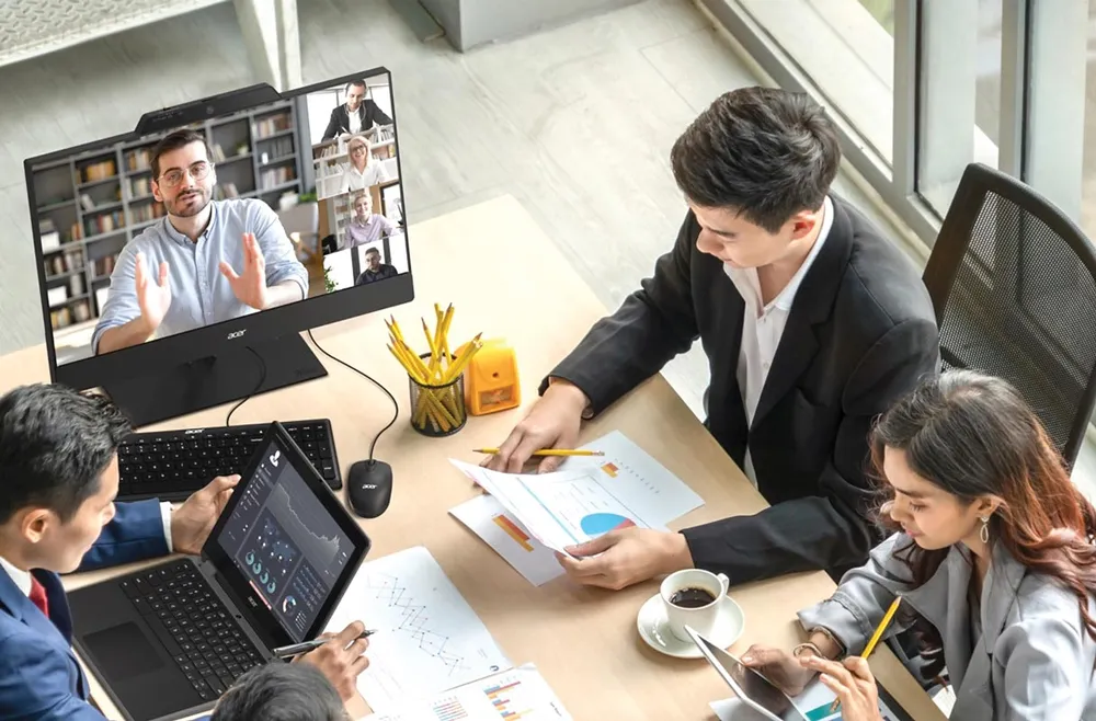 Acer Add-In-One 24 vừa vặn với bất kỳ bàn làm việc nào hoặc trong bất kỳ phòng họp có kích thước nào và được tối ưu hóa cho hội nghị truyền hình với webcam góc rộng 1150 tích hợp với màn trập camera tích hợp, micrô kép và loa 4 watt kép.
