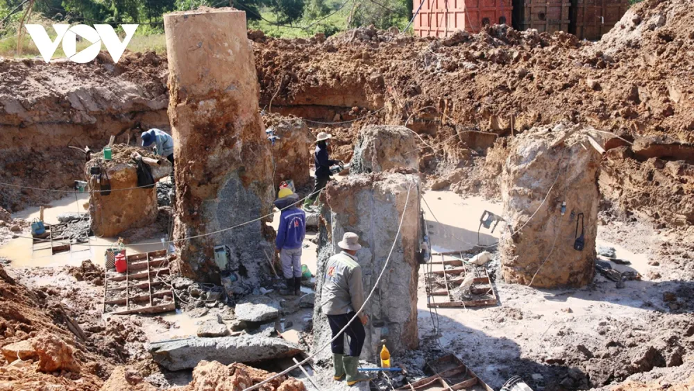 Công nhân đang đục các cọc khoan nhồi chuẩn bị làm bệ đỡ cầu vượt ở nút giao Bình Chuẩn (Ảnh: TL).