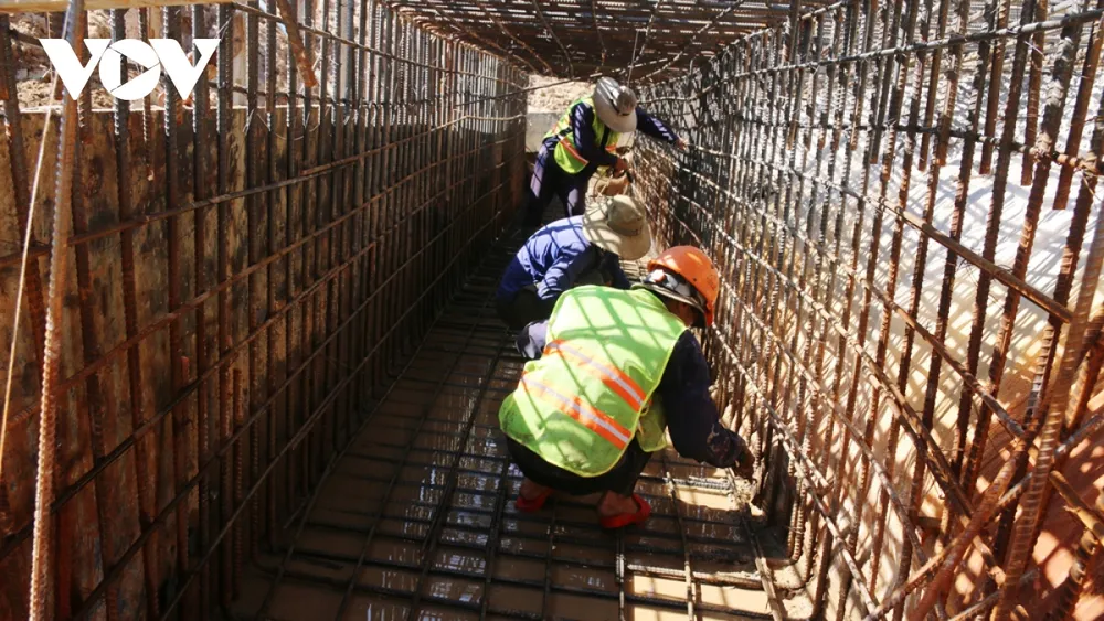 Mặc cho trời nắng như “đổ lửa”, có lúc lên đến 39oC, nhưng những công nhân vẫn miệt mài buộc từng sợi thép, hàn từng đoạn sắt, đổ cọc nhồi… để chạy đua với thời gian.