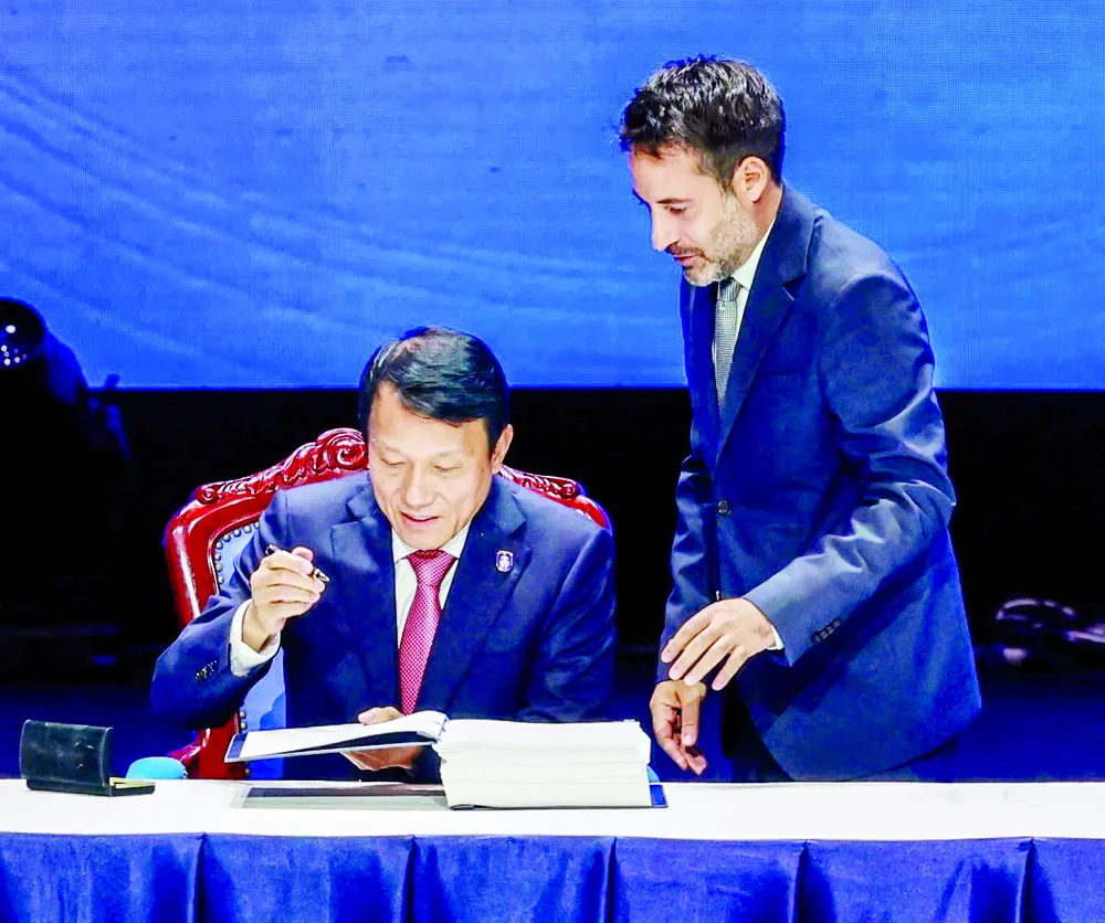Theo nghi lễ điều hành của LHQ, Đại tướng Lương Tam Quang, Bộ trưởng Bộ Công an, đại diện nước chủ nhà Việt Nam, đặt bút ký vào Công ước Hà Nội. Ảnh: VIẾT CHUNG