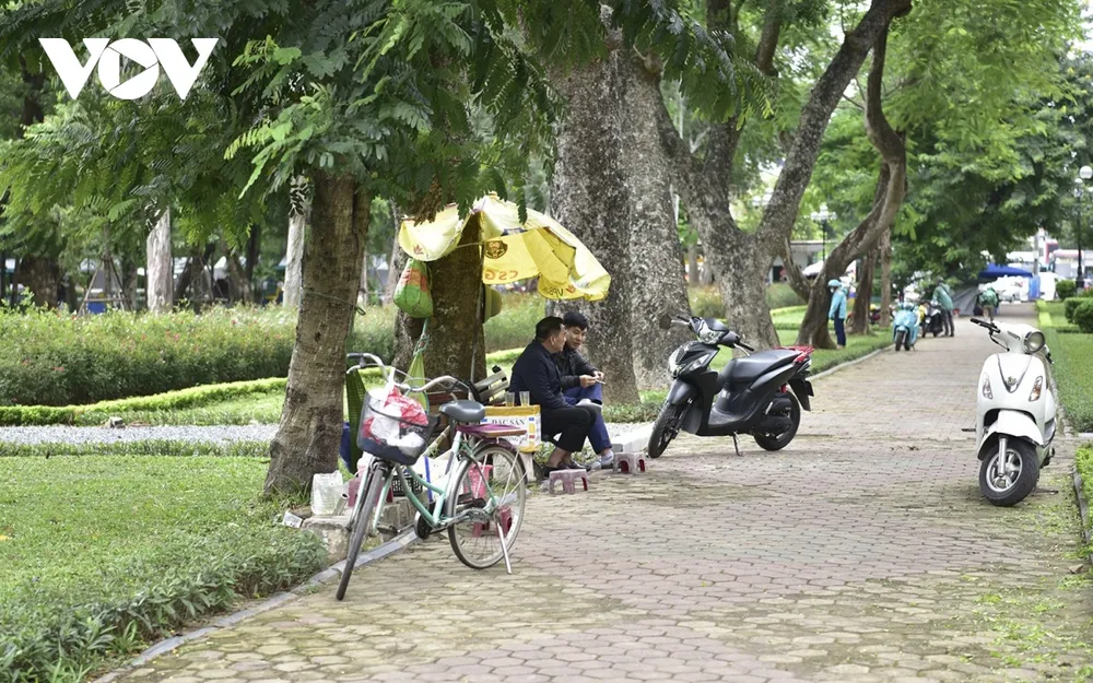Tại khu vực “mở” của công viên, nhiều người vô tư đi xe máy, xe đạp lên vỉa hè. Ngoài ra, các quán trà đá di động tự phát ngang nhiên hoạt động mà cơ quan chức năng vẫn chưa lên tiếng.