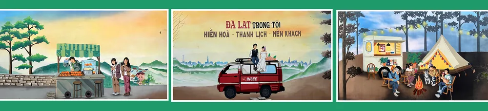Các bức họa vẽ theo tỷ lệ thực 1:1 trên bờ taluy đường Phạm Hồng Thái tái hiện một phần phong cảnh, văn hóa Đà Lạt