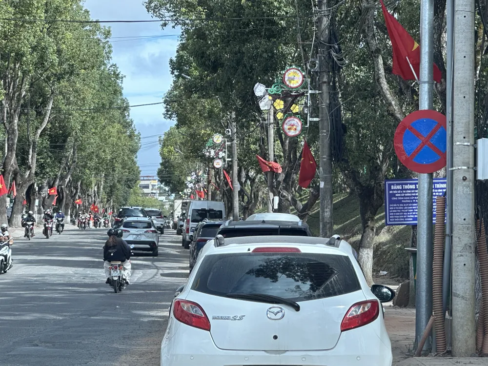 Đường Phù Đổng Thiên Vương, phường 8, TP Đà Lạt đang thi công. Tình trạng phương tiện đậu đỗ lộn xộn ngay sau bảng cấm dừng, đỗ ảnh hưởng đến quá trình thi công, chỉnh trang