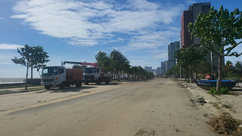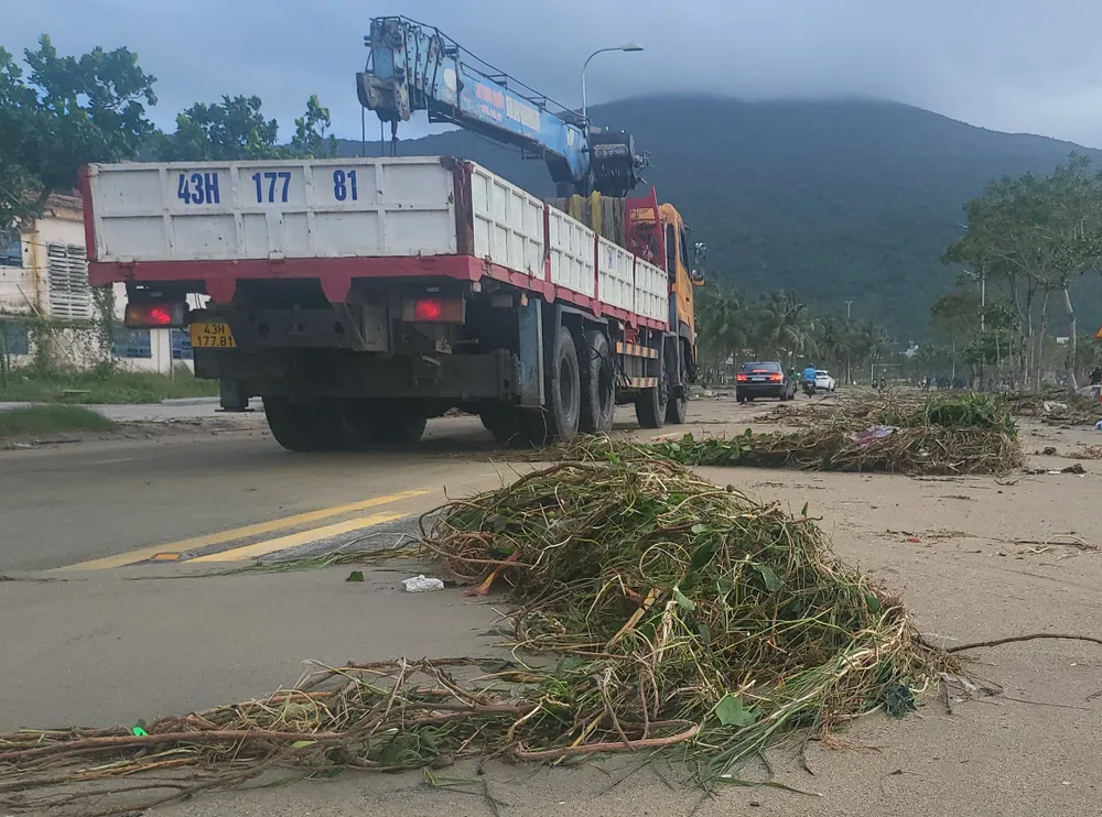 Sáng 7-11, sau bão số 13, tuyến đường Hoàng Sa (từ đoạn đối diện đường Lê Đức Thọ đến đường Vương Thừa Vũ, phường Sơn Trà, TP Đà Nẵng) ngập tràn rác thải bị sóng và nước mưa cuốn dồn, chất thành đống trên mặt đường. Nhiều cành cây gãy, lá vụn rơi vương vãi, gây cản trở giao thông.