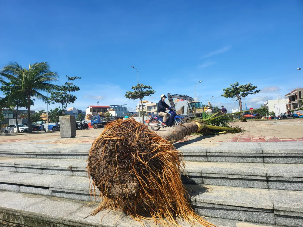 Ghi nhận tại khu vực bãi biển phường Sơn Trà, do ảnh hưởng gió mạnh trong đêm 6-11, một số cây dừa bị bật gốc, gây ảnh hưởng đến cảnh quan địa phương.