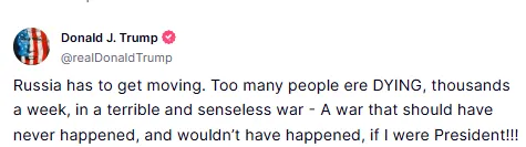 Tổng thống Hoa Kỳ Donald Trump bày tỏ sự thất vọng về tiến triển chậm chạp trong các cuộc đàm phán hòa bình. Trên nền tảng mạng xã hội Truth Social của mình, ông Trump đã đăng: "Nga phải hành động. Quá nhiều người (đang) CHẾT, hàng nghìn người mỗi tuần, trong một cuộc chiến khủng khiếp và vô nghĩa — Một cuộc chiến không bao giờ nên xảy ra, và sẽ không xảy ra, nếu tôi là Tổng thống!!!”.