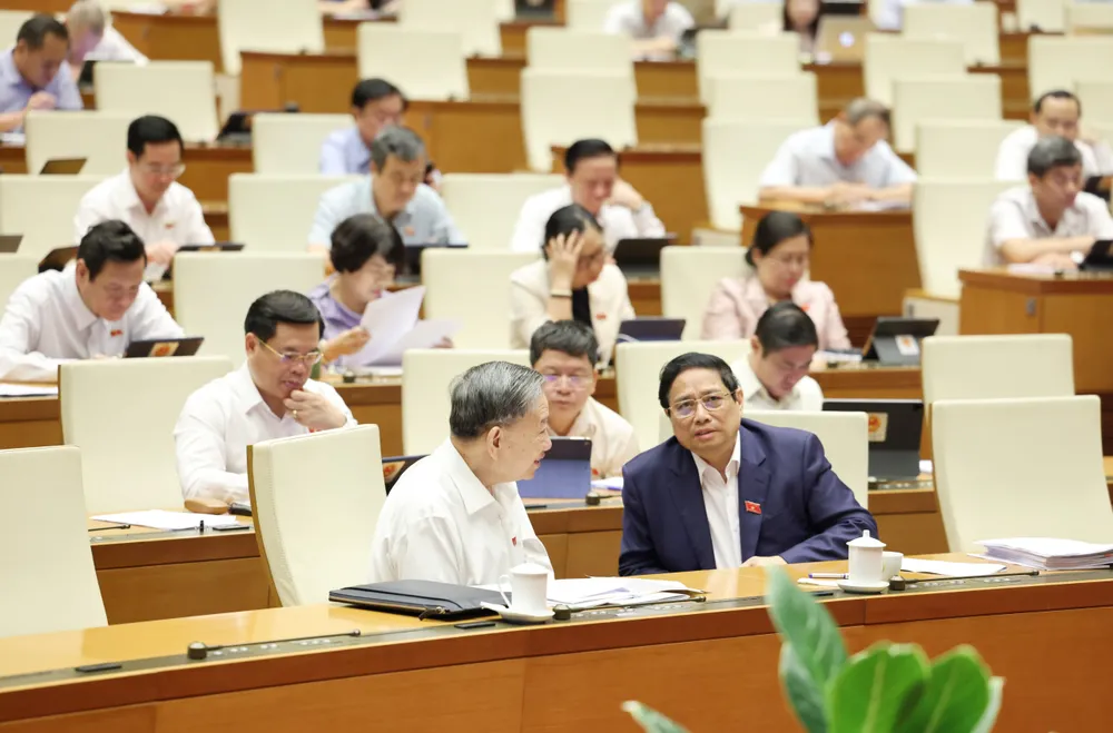 Chủ tịch nước Tô Lâm và Thủ tướng Phạm Minh Chính dự phiên họp Quốc hội sáng 3-6. Ảnh: QUANG PHÚC