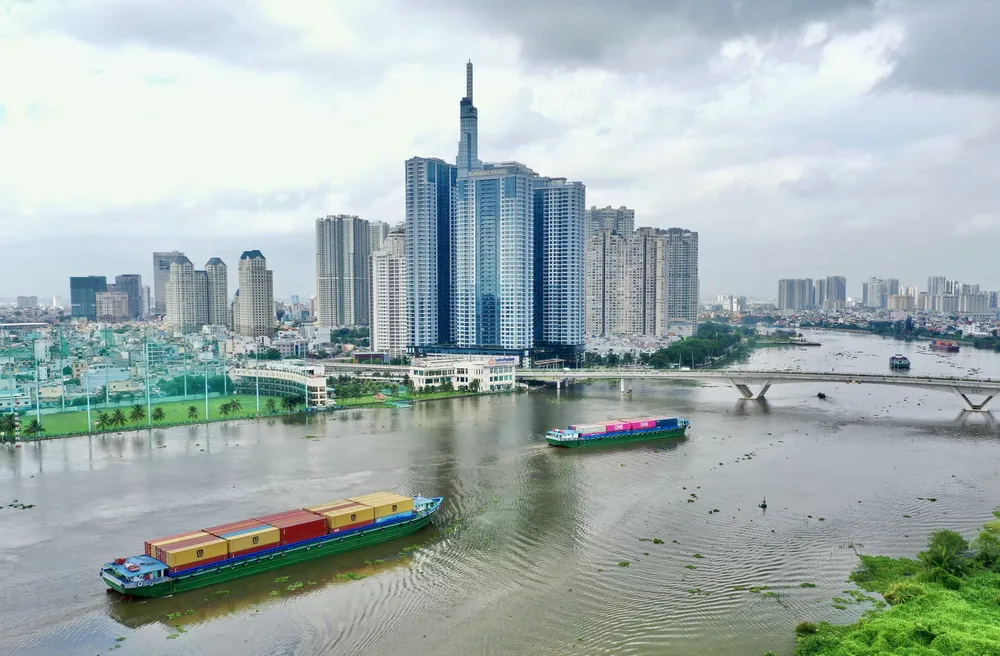 Tàu container trên sông Sài Gòn giao thương hàng hóa liên vùng. Ảnh: HOÀNG HÙNG