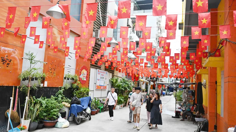 Khu phố 22, hẻm 100, phường Bến Thành rợp cờ Tổ quốc. Ảnh: MẠNH THẮNG