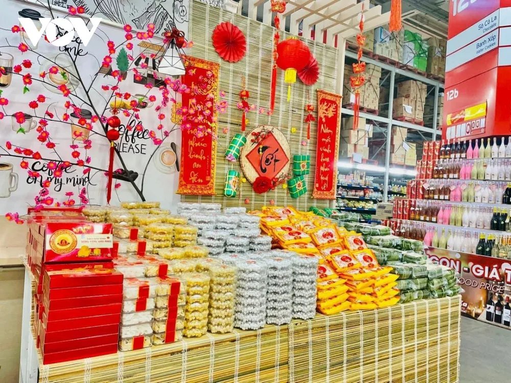 Thời điểm này, tại các trung tâm thương mại, siêu thị, cửa hàng tiện lợi… tràn ngập hàng hoá phục vụ nhu cầu mua sắm tết của người dân. Những hàng hóa thiết yếu, đặc trưng của ngày Tết như: bia, nước giải khát, bánh, mứt, kẹo, khay mứt… được chia thành từng khu chuyên biệt để tiện cho người tiêu dùng lựa chọn, mua sắm. Nhiều người tiêu dùng cho biết, mẫu mã hàng tết thay đổi theo từng năm và ngày càng chất lượng, màu sắc phù hợp với không khí tết, giá thành phải chăng. Cùng với đó, nhiều chương trình giảm giá, kích cầu mua sắm được áp dụng vào dịp này cũng là một lợi thế để mua sắm.