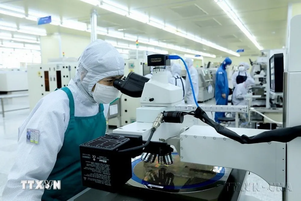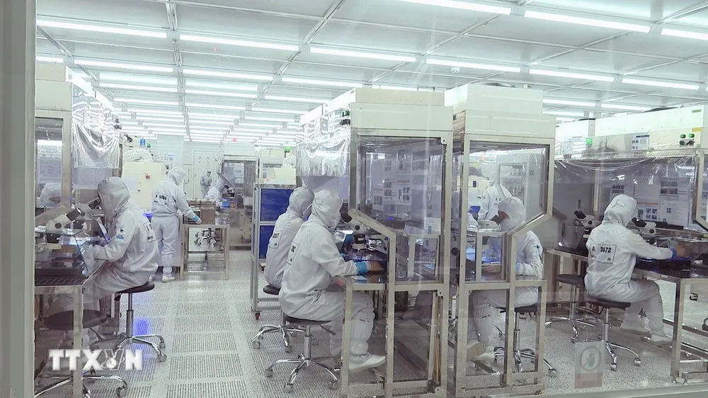 Công ty TNHH Hana Micron Vina 100% vốn đầu tư của Hàn Quốc, chuyên sản xuất và gia công bảng vi mạch tích hợp sử dụng cho điện thoại di động và các sản phẩm điện tử thông minh khác. (Ảnh: Tuấn Anh/TTXVN)