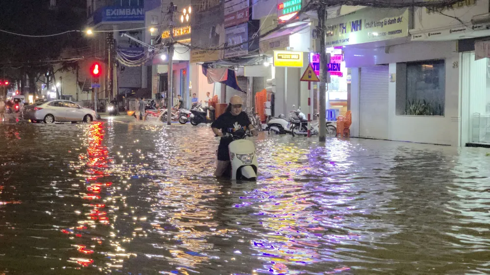 Nhiều điểm ngập sâu lên đến 30-50cm khiến hàng loạt xe mô tô chết máy, các phương tiện khác cũng phải di chuyển rất chậm để băng qua dòng nước.