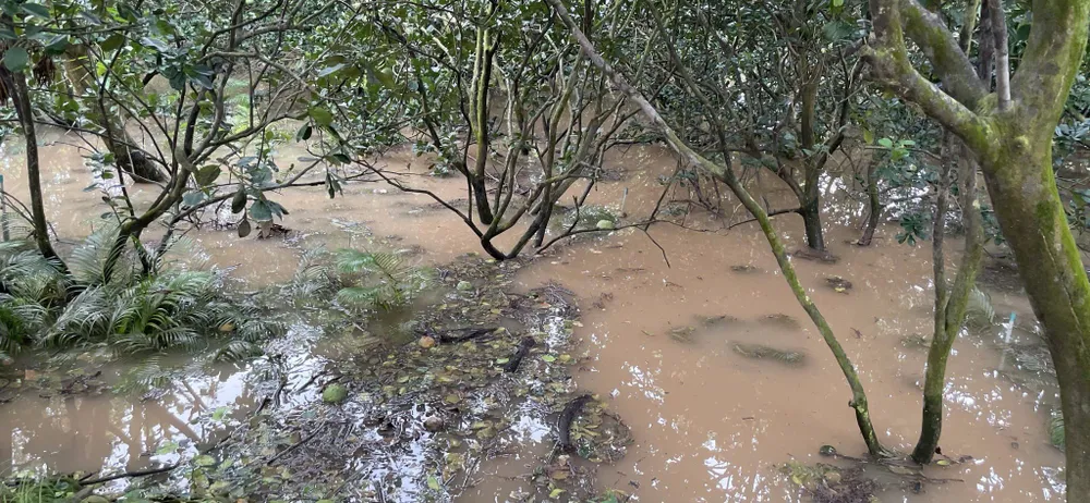 Sau sự cố, nhiều diện tích cây trồng như xoài, bưởi da xanh bị ngập sâu, nguy cơ hư hại cao nếu nước không rút kịp thời.