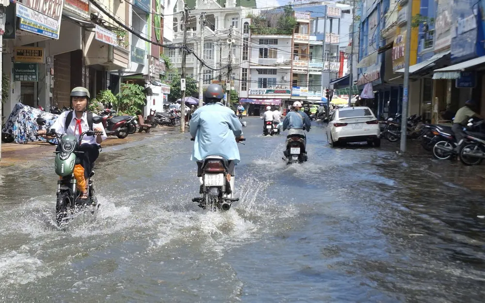 Đường Đề Thám (phường An Xuyên, tỉnh Cà Mau) bị ngập do triều cường vào ngày 24-10. Ảnh: TẤN THÁI